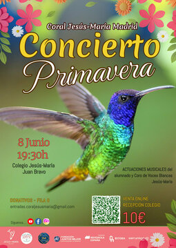 La Coral Jesús María Madrid celebrará en la Capilla del Colegio Jesús María Juan Bravo su tradicional Concierto de Primavera el próximo jueves 8 de junio a las 19:30h. Contaremos con la participación del alumnado del colegio y del Coro de Voces Blancas Jesús María. Siendo siempre solidarios con los más necesitados, os esperamos con mucha ilusión.
